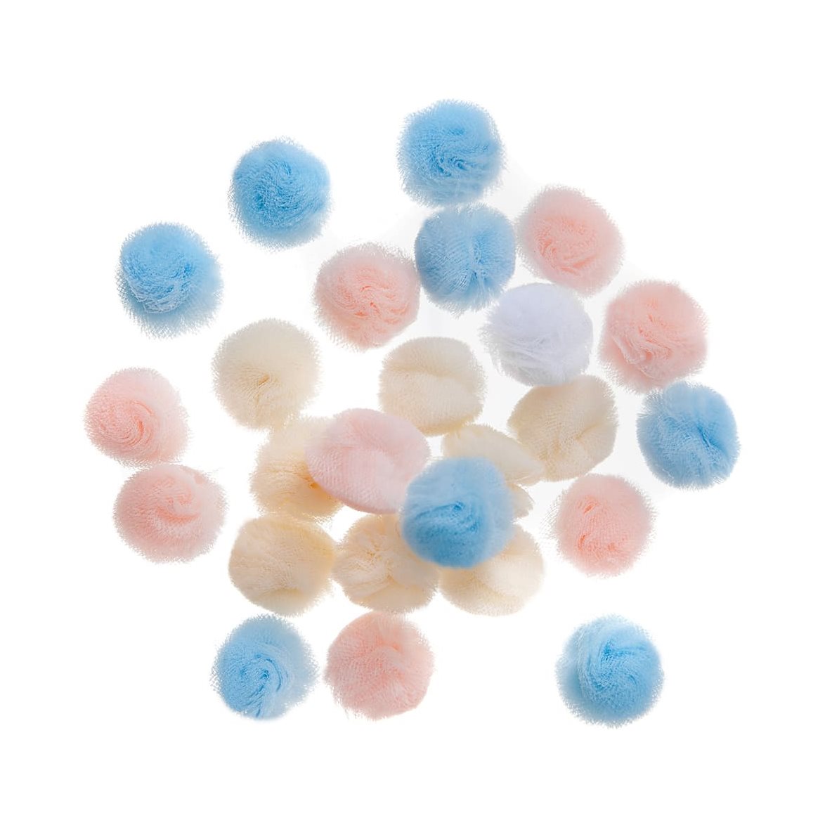 Dekorativa mini-pompoms i mjuk tyll är en inspirerande detalj som lyfter ditt projekt. De mjuka pastelltonerna ger en lätt och romantisk touch.