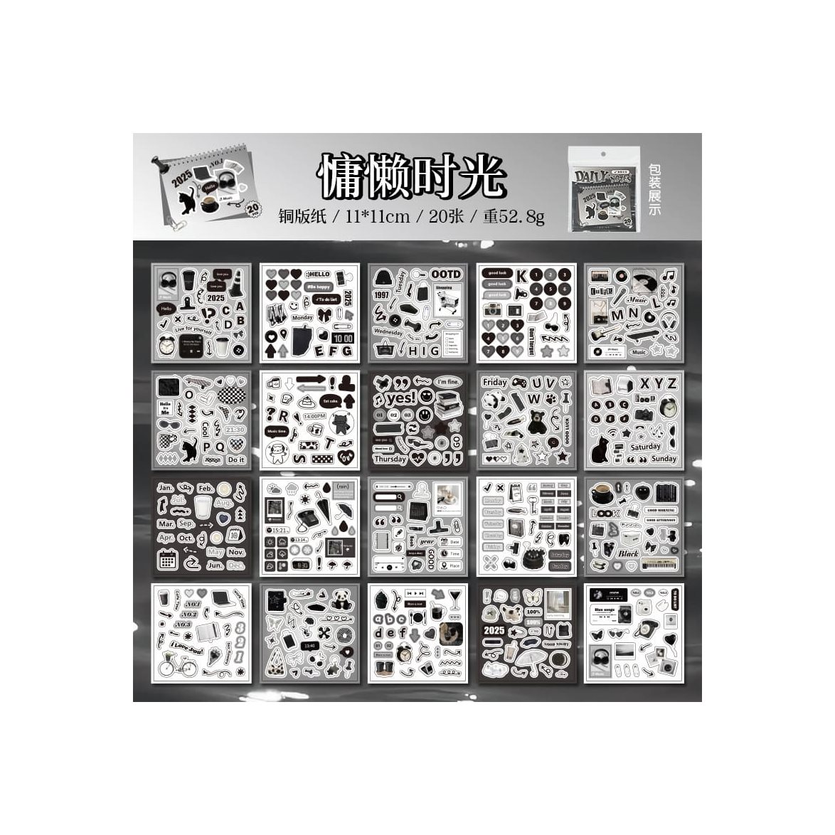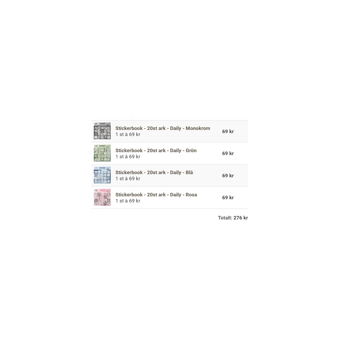 Innehåller 1st av varje nedan:Stickerbook - 20st ark - Daily - MonokromStickerbook - 20st ark - Daily - BlåStickerbook - 20st ark - Daily - RosaStickerbook - 20st ark - Daily - Grön