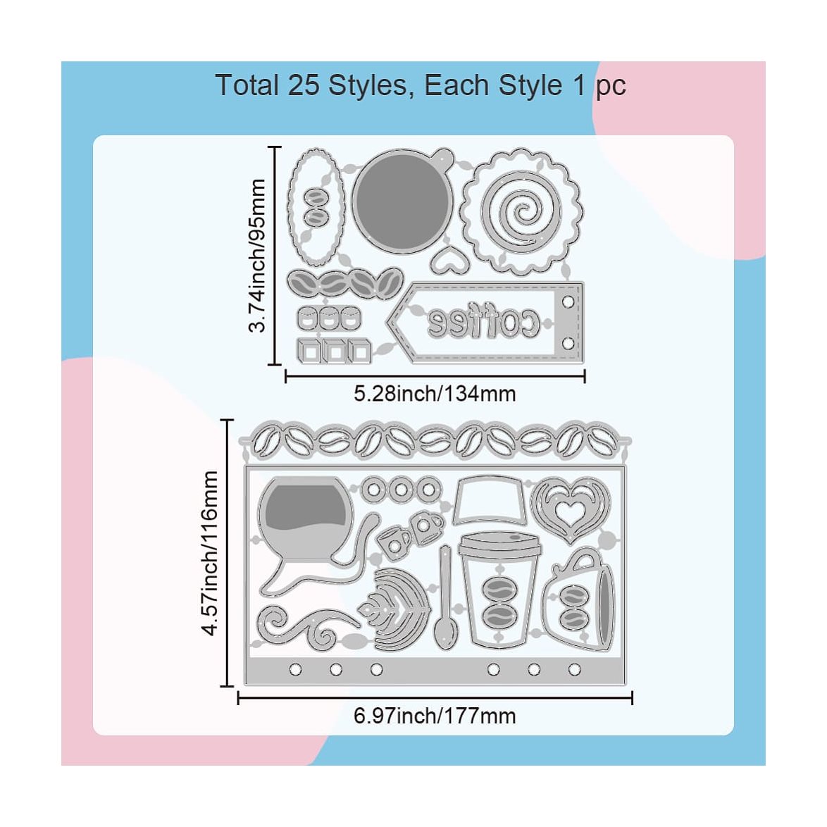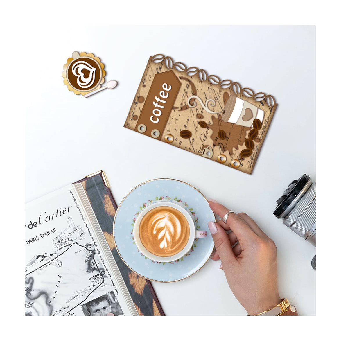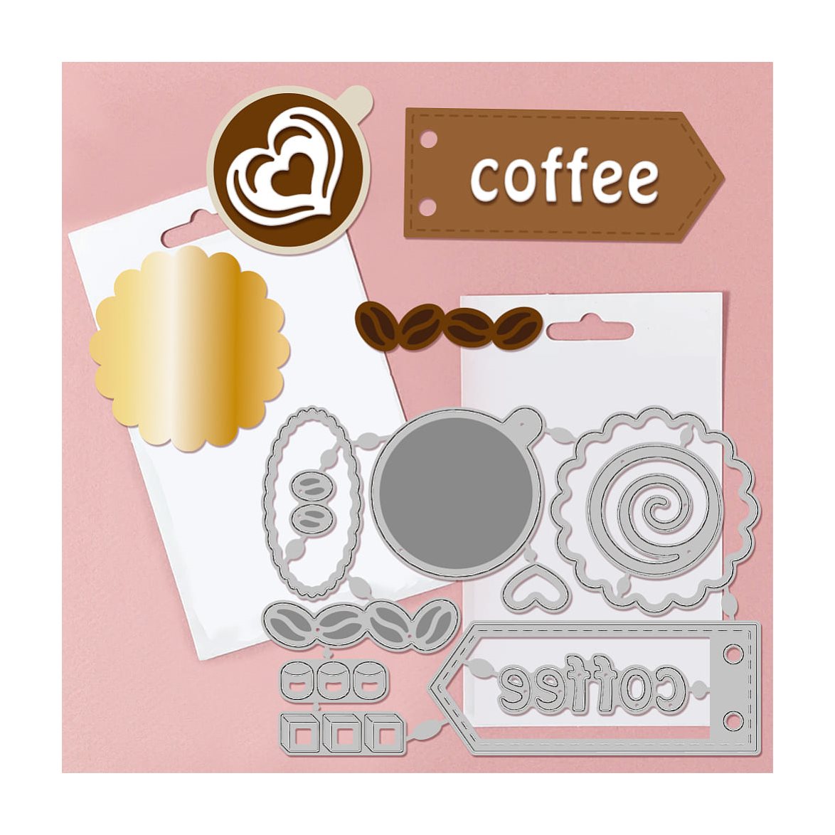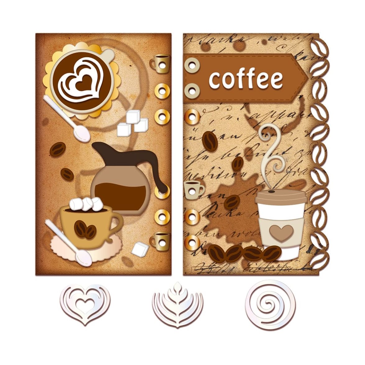 Med detta die-set kan du skära ut en te-kopp/kaffekopp, en take-away mugg, kaffekanna, tags, en bård av kaffebönor, en journal-sida och massor med tillbehör så som kaffebönor, skedar, skum-mönster mm. Tidlöst, kreativt och alldeles oemotståndligt.
