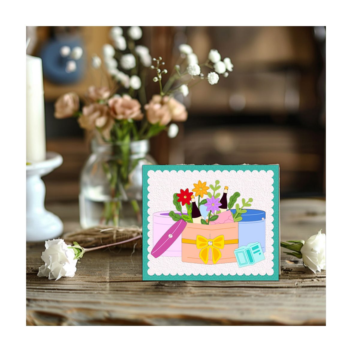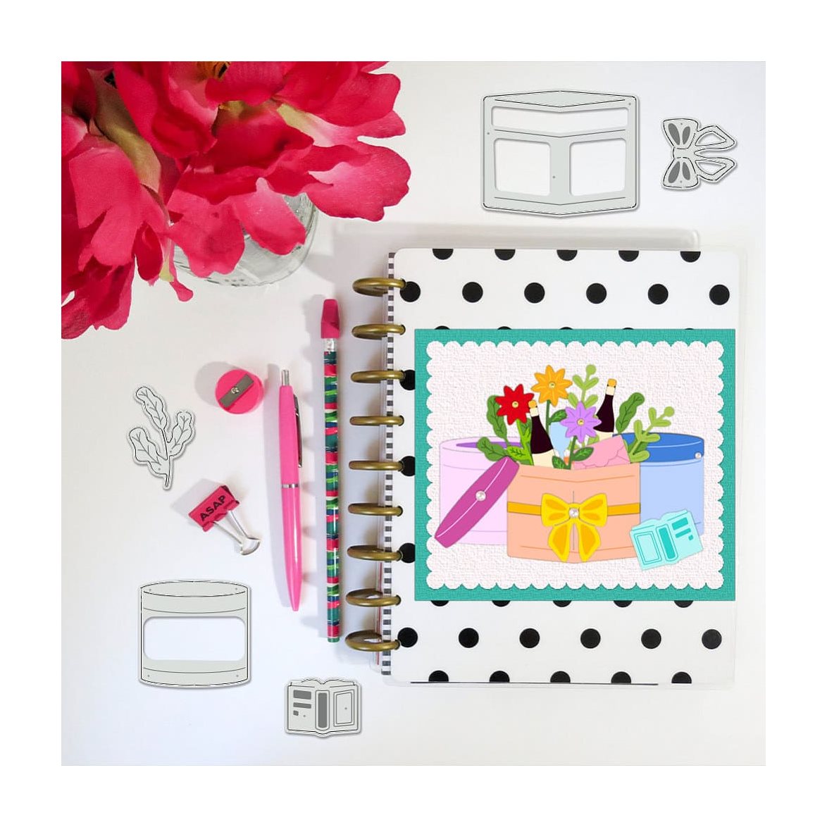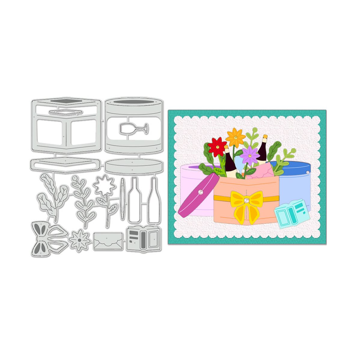Med detta die-set kan du skära ut vackra presentaskar med tillbehör så som kvistar, rosett, kuvert, bok och vinflaskor. Tidlöst, kreativt och alldeles oemotståndligt.