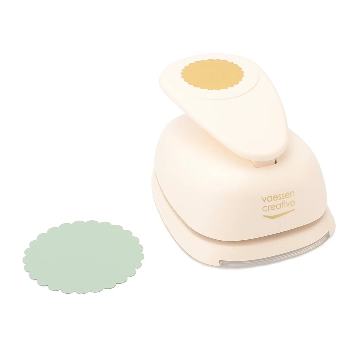 En högkvalitativ cirkelstans med vågig kant som stansar ut en perfekt cirkel i papper, foton, tunn kork och foam.