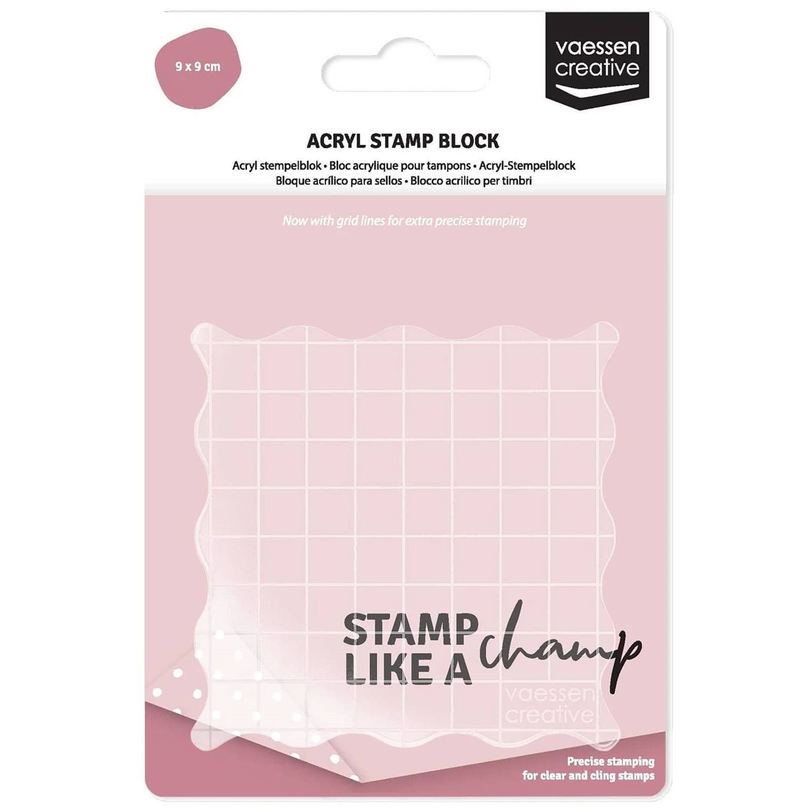Ett akrylblock används tillsammans med omonterade stämplar, exempelvis clearstamps och clingstamps. Stämpeln fästs enkelt på blocket och eftersom akrylblocket är genomskinligt ser du enkelt vart du ska stämpla. De här akrylblocken har rutnät så du enklare stämplar rakt.