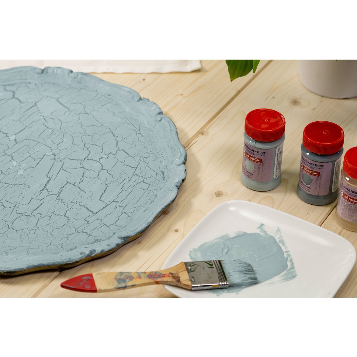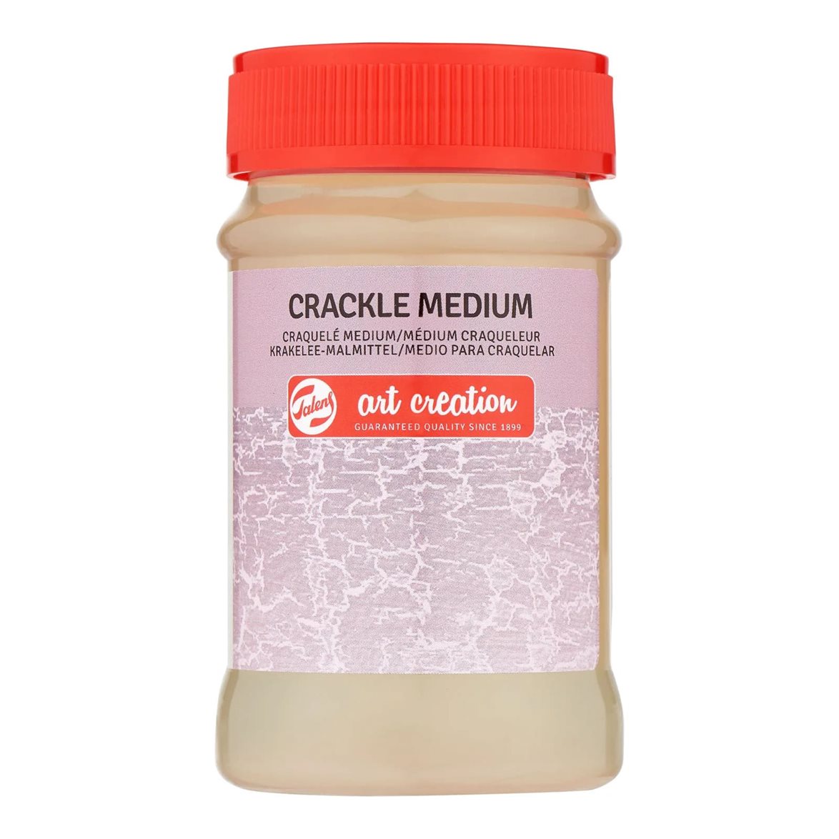 Krackeleringsmedium från Talens. Måla på vald yta, låt torka ca 1-2 timmar, när lacket har torkat har det skapat en krackelerad yta. Om man vill kan man då måla på en kontrastfärg (akrylfärg) för extra effekt.