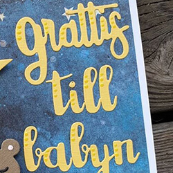 Ett kort med en söt sovande nallebjörn till en nyfödd. Här har jag kombinerat vår egna grattis-die med bokstäver från Marianne Designs brush alphabet. Alla produkter som använts finns listade nedan.