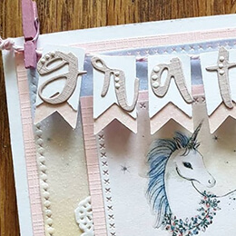 Ett kort perfekt till den som gillar rosa, regnbågar och enhörningar. Jag har använt underbara papper från blocket enchanted meadows med glittereffekt, även den söta enhörningen kommer från det blocket. Det och alla andra produkter som använts finns listade nedan.