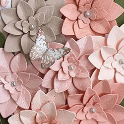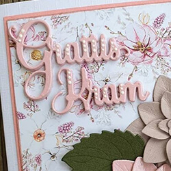 Ett grattiskort i rosa med en stor hortensia och några fjärilar. Alla produkter som använts finns listade nedan.