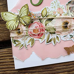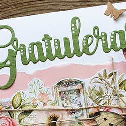Ett gratulationskort i rosa och grönt. Till detta har jag använt ett rosa vellumpapper, natursnöre samt utklippta fjärilar. Alla produkter som använts finns i listan nedan.