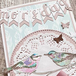 Ett kort till morsdag med fåglar och lite gröna växter. De vackra fåglarna är utklippta från ett mönserpapper från pappersblocket Paper Flowers 20x20cm. Se alla produkter som använts nedan.
