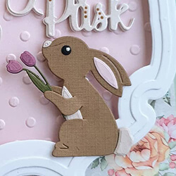 Ett påskkort med en söt liten kanin och en kanna med vårkvistar. Alla produkter som använts finns listade nedan.