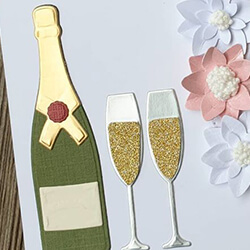 Ett studentkort i vitt och rosa, med en champagneflaska och tillhörande glas. I glasen har jag klistrat guldigt glitterpapper som champagne och glasen är utstansade i silver metallic-papper. Alla produkter som använts finns listade nedan.